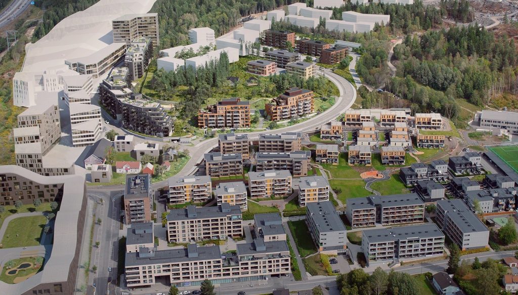 NY SKILANDSBY: Slik skal det se ut når alle byggeprosjektene i nærheten av SNØ står ferdig. Snølia er prosjektet som ligger nærmest «bakken». Foto: Selvaag Bolig